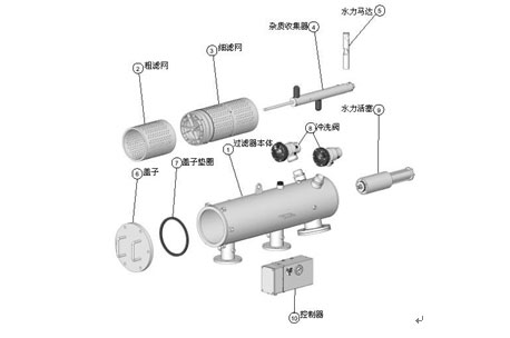 水力驅動自清洗過濾器由主管組件、端蓋組件、細濾芯組件、粗濾芯組件、吸污器組件、水力馬達、水力缸組件、排污閥、管路控制系統(tǒng)等主要零部件組成。水由入水 口進入過濾器,首先經過粗濾芯組件濾掉圈套顆粒的雜質,然后到達細濾網,通過細濾網濾除細小顆粒的雜質后,清水由出水口排出。